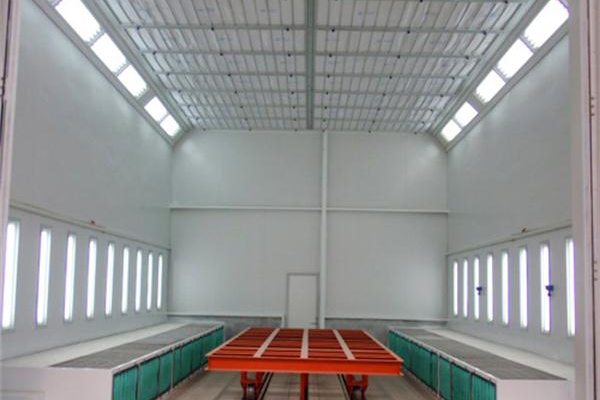 噴漆室體是噴漆工人的工作區域。噴漆室的室體以鋼結構支架壁板和玻璃墻板于一體,室體前端設有工件進出通道,側面設有大型采光窗,室內寬敞明亮。室體的上部設有被動進風過濾層,使空氣按層流狀態均勻的進入噴漆室內。室體頂部的終效過濾層由一塊塊過濾板組合而成,在噴漆室頂部可以很方便地拆裝和清理。室體兩側面均勻布置有多組隔爆照明燈,保證噴漆施工所需要的照度。由于噴漆室內氣流呈垂直向下的層流狀態,而且具有一定的速度,室體壁板和玻璃墻板表面經常被氣流沖刷,幾乎不被漆霧污染,能夠保持明亮和清潔狀態,清理工作量極少。